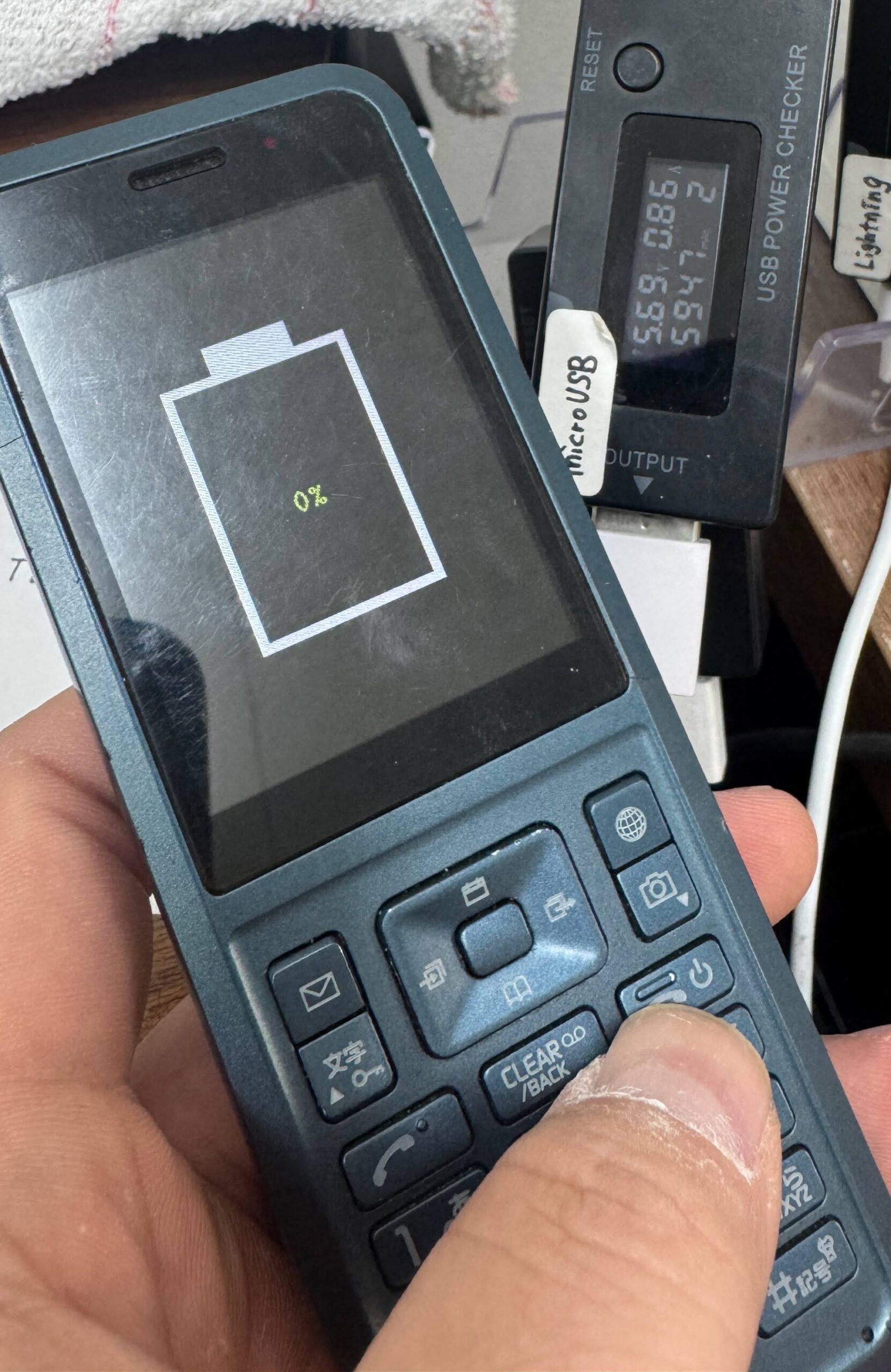 修理前は全く反応がありませんでしたが、壊れた充電ポートを修復した結果、充電中であることを示すバッテリー残量ゲージが液晶に表示されるようになりました。無事に修理完了です!