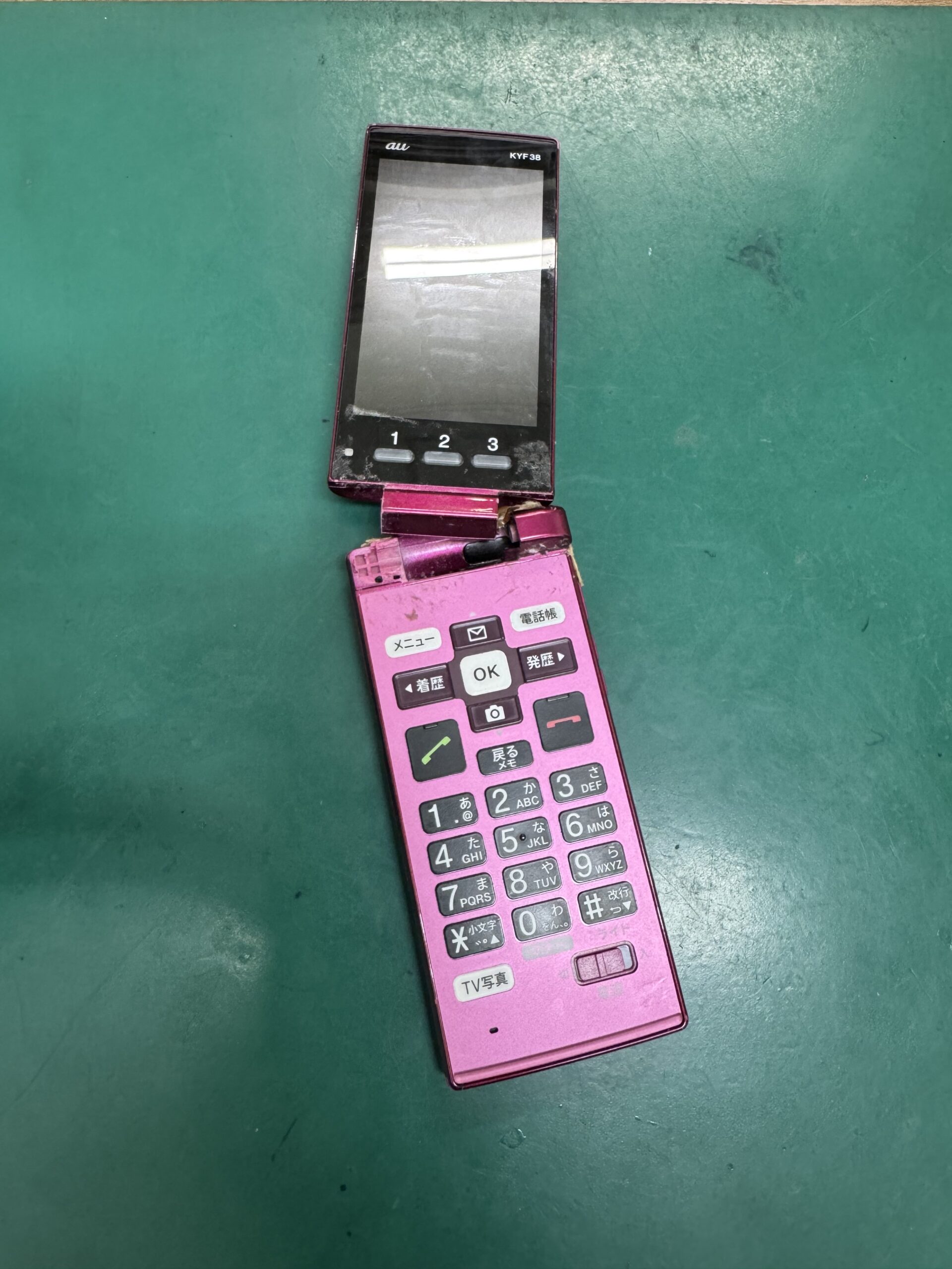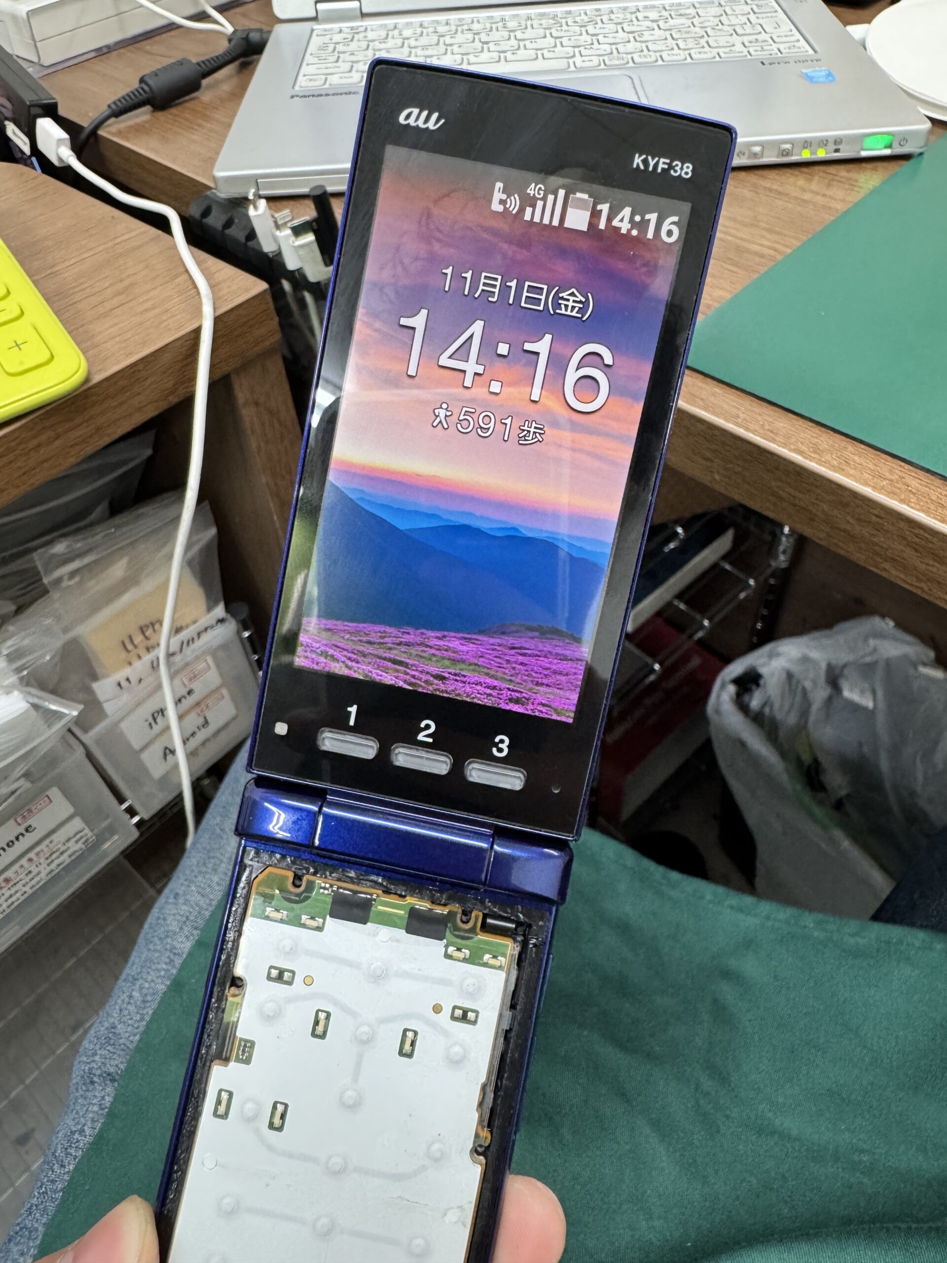 修理には専用のパーツを使用し、割れてしまった部分や内部のケーブル、接合部分を新しいものに交換しました。京セラのガラケーに精通したスタッフが担当し、丁寧に組み立て作業を進めました。