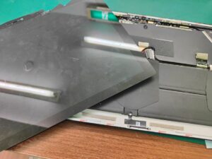 画面を交換しつつ、フレームの変形も可能な範囲で修復しておきます。(スマホやタブレットのフレーム変形は完璧には綺麗に出来ないこともありますので、事前に説明してご了承をいただいております)