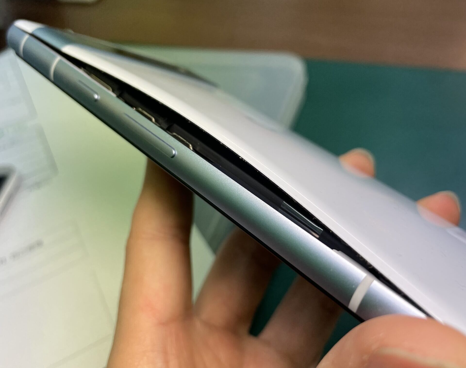 これぐらい背面パネルが浮いていると逆に作業はしやすいです。 残りの接着を慎重に取り外し内部にアクセスします。膨張しているバッテリーは少しの衝撃で内部に溜まったガスが出てくることがありますのでバッテリー周辺は更に慎重になります。 膨張しているバッテリーと新しいバッテリーを交換すれば作業は完了です。