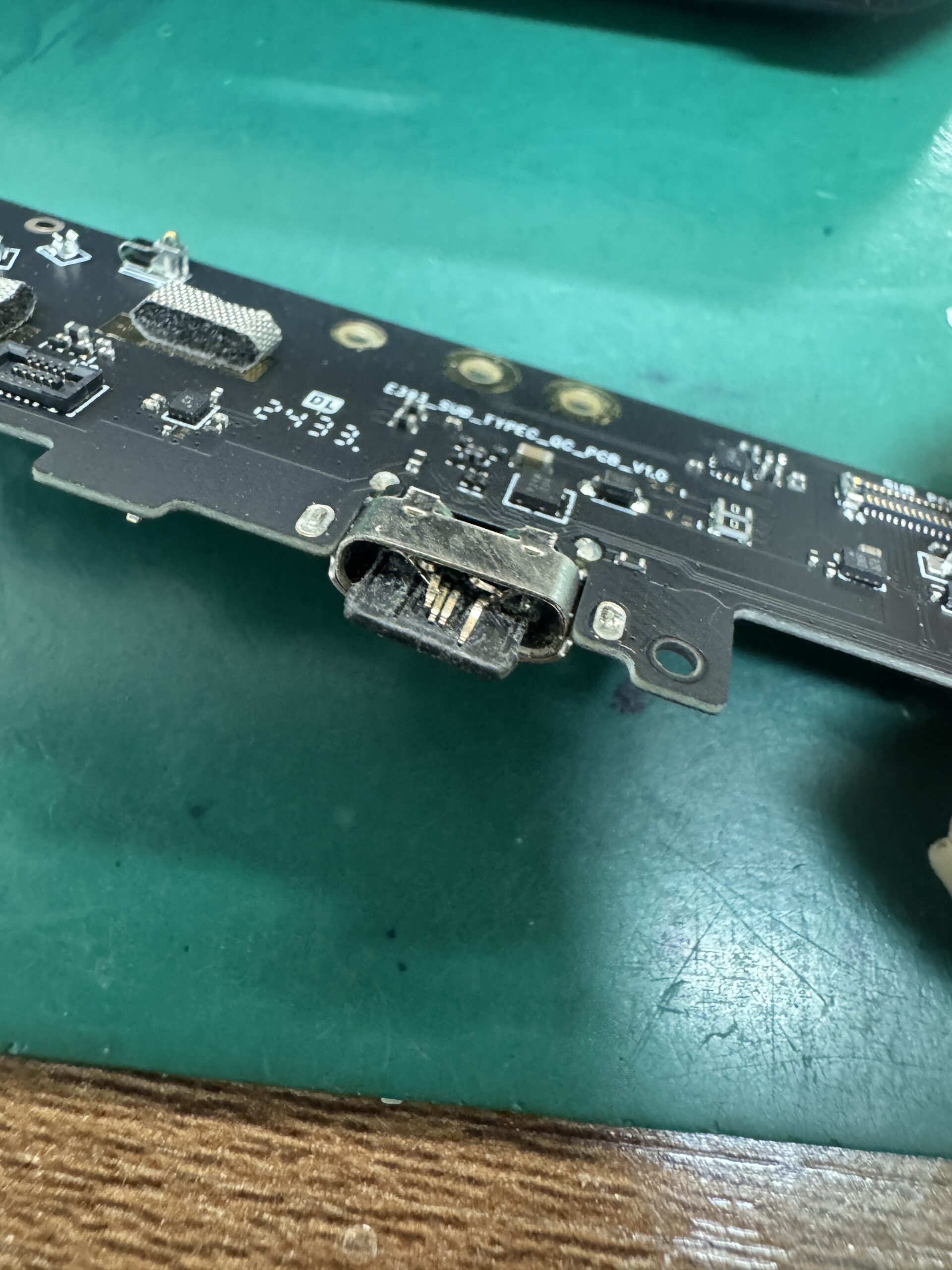 基板に直接取り付けられている Type-C ポートを半田ごて等を駆使して取り外し、形状とピン配置に互換性がありそうな、 別モデルのスマホの Type-C ポート を選定。