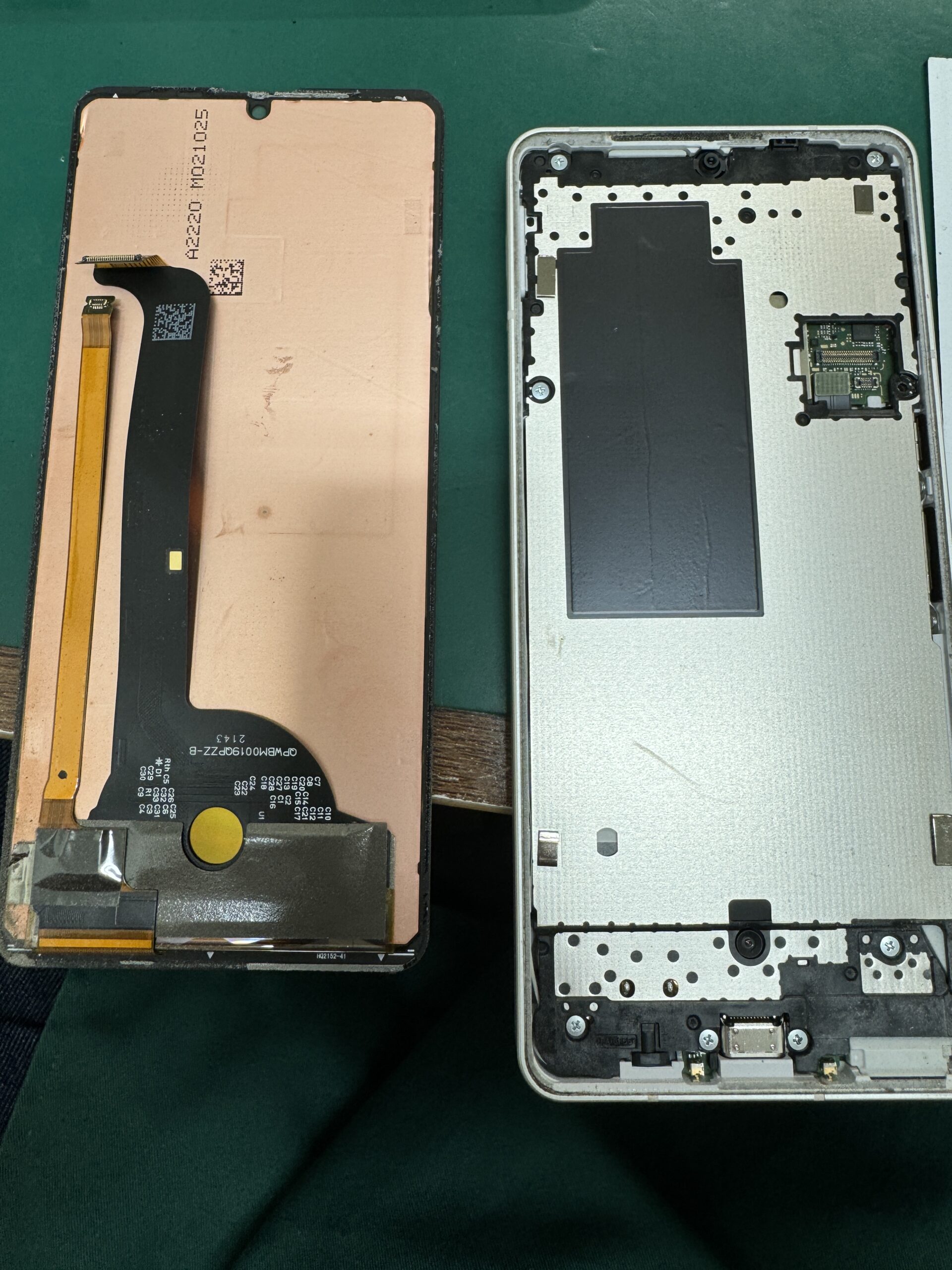十分に注意しつつ、無事に画面を外せたら、あとは損傷している充電ポート周りの回路を修復します
