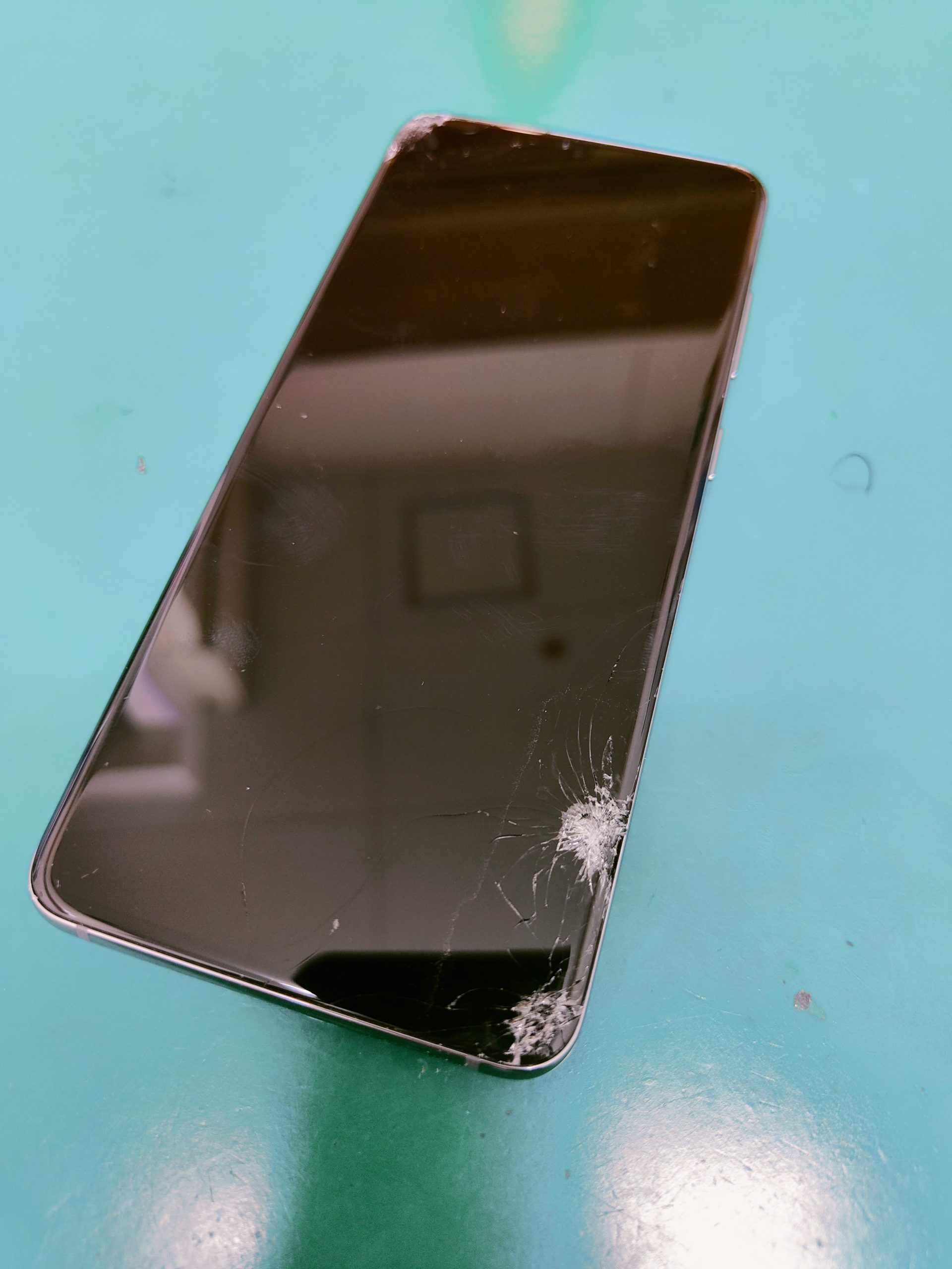 地面に落としてしまい、ガラスが割れ、さらに画面が真っ暗で映らなくなってしまったGalaxy S10の修理を行いました。