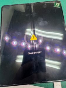 受付にて状態を確認すると、何をしても電源が入らないものの、充電ケーブルを挿し込んだ際にだけ「Check Battery」の文字が表示されます。