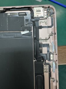 iPadの内部には、ApplePencilとiPad本体をワイヤレスで接続・充電するためのアンテナケーブル(仮)のような部品が取り付けられています。水没した際の液体の流れ込み方によっては、このアンテナに液体が触れてショートする可能性も十分に考えられます。